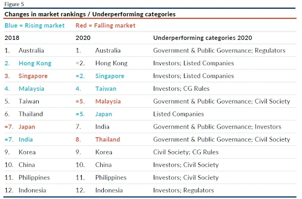 亞洲公司治理協會(ACGA)在2023年12月公布了最新的區域排名結果,令人驚訝的是,日本排名為亞洲區的第一*(短評是:Strong govt reform programme, TSE proactive and improved listed company performance),擠下長期居於榜首的新加坡,以往列於第一或第二的香港,更是被甩到後面、排名大幅倒退。